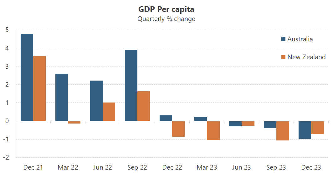 For decades, the once-vaunted New Zealand economy has been falling behind other advanced economies on several key indicators. It’s currently in its second technical recession in the past 18 months (defined as two consecutive quarterly contractions), and perhaps even more worryingly on a per capita basis has been shrinking for five consecutive quarters. By contrast, Australia has ‘only’ contracted for three consecutive quarters (woohoo!). Seriously though, we have nothing to boast about; for the past two years we’ve barely had any per capita growth and in the most recent quarter we actually underperformed the Kiwis.