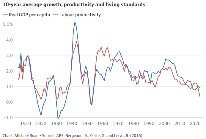 Productivity growth in both Australia and New Zealand is now in the gutter (negative in both countries in 2023), and our policymakers won’t have another mining boom to rescue us this time. If we don’t get meaningful productivity-boosting reform soon, then we’re destined to end up like the Kiwis:
