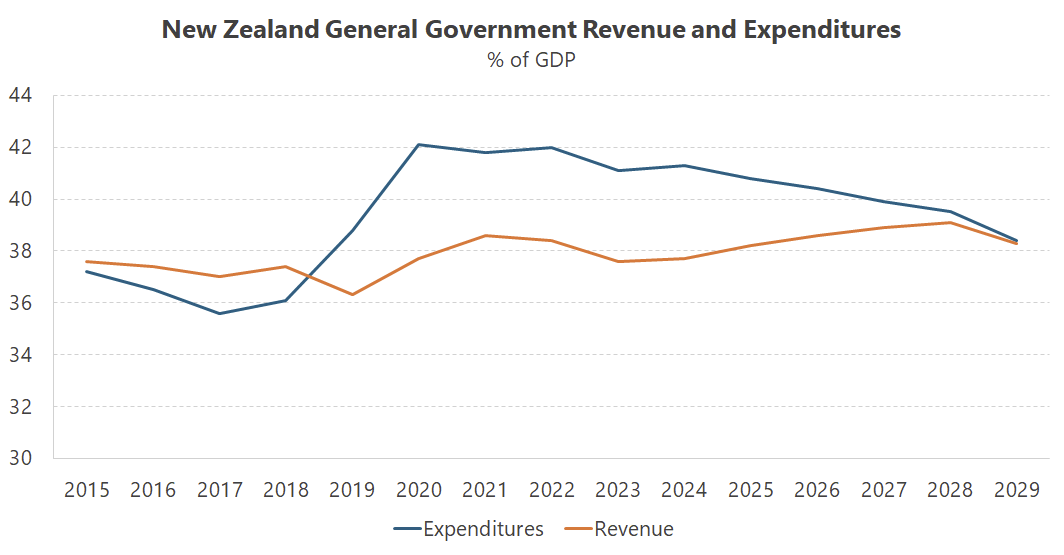 That really just serves to highlight how poorly their economy is faring: despite all that government spending, New Zealand is still contracting on an absolute and per capita basis. And because of its structural fiscal deficit, the IMF’s latest update expects the government to continue spending well more than it collects until at least around 2030: