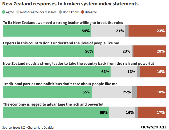 The Kiwis are, understandably, upset about their lot. A new survey by IPSOS found that they are growing increasingly angry at the “establishment”, with most agreeing that the system is “broken”.