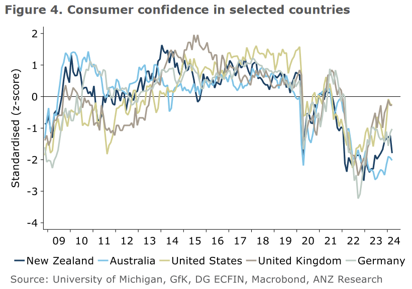 But, wrote the authors, “at least we’re still ahead of Australia”, offering the following chart showing consumer confidence in Australia sitting below New Zealand, the US, UK and Germany: