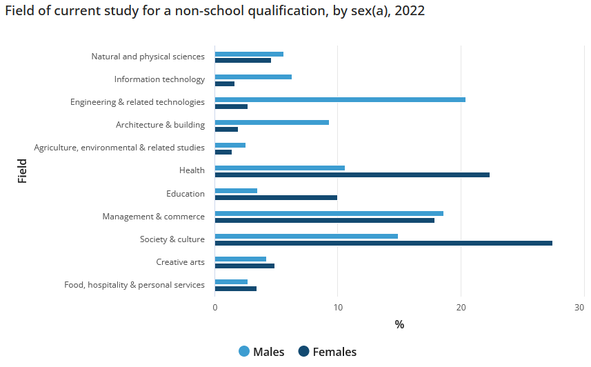 According to Goldin, a large part of the gender earnings gap is explained by two factors. First, women tend to self-select into occupations that are more flexible – while women are more highly educated than men on average, their representation in STEM fields is still very low. It’s also likely to stay low given the distribution of current students, with far more women studying ‘society & culture’ and ‘health’, and more men in ’engineering & related technologies’ and ‘information technology’. The average pay gap that Minister Gallagher wants to close will stay wide open so long as women remain underrepresented in higher-paying STEM occupations.