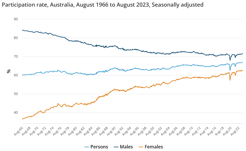 Goldin showed that there are two kinds of gender gaps, employment and earnings. In Australia, the former has narrowed as participation rates of men and women changed over time: men dropped from a 84.2% participation rate in 1966 to 71.7% today, while women have dramatically increased theirs from 36.6% to 62.5%.