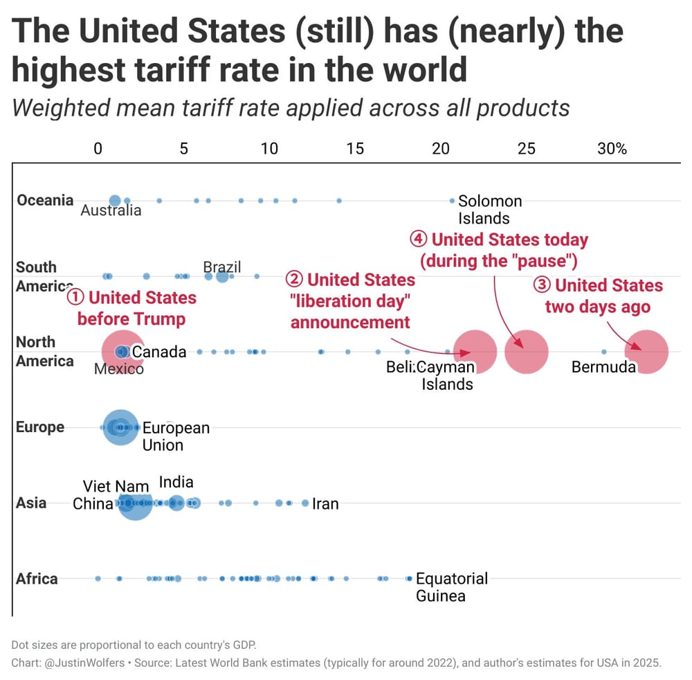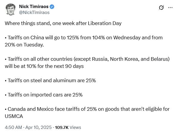 Some strong Paul Keating vibes there. But alas, while the most destructive ‘Liberation Day’ tariffs have been paused for 90 days, many still remain in place:
