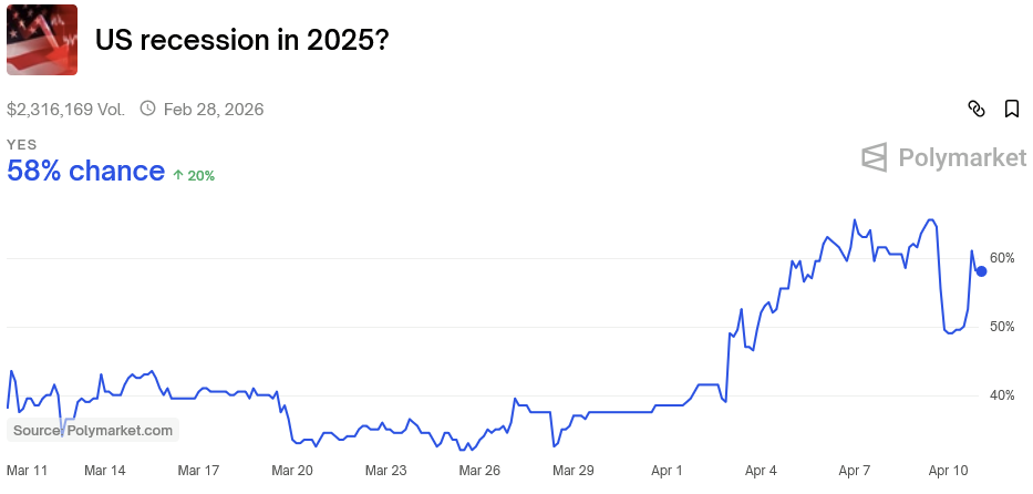 That means we’re not out of the woods by any means— US markets tanked again last night, and US 10-year bond yields are almost back to where they were when Trump hit pause. The chance of a recession this year is also back up to nearly 60%: