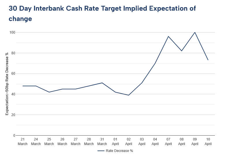 As a result, NAB came out yesterday and said it expects a 50 basis point cut in May. Futures markets are pricing pricing in a 73% chance of a 25 basis point cut, although those odds have been incredibly volatile since the ‘Liberation Day’ tariffs: