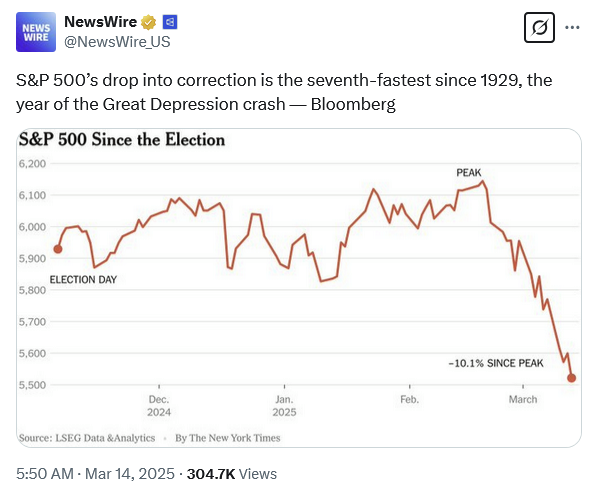 - Trump may be repeating the mistakes of Roosevelt that worsened the Great Depression: “Shortly after the U.S. imposed the retained profits tax in 1936, the economy slumped. The S&P Index dropped 35% from peak to trough. Business investment collapsed. A survey of Illinois manufacturers found that 83% had deferred or abandoned plans for expansion. It was called the ‘Roosevelt Recession.’ Lammot du Pont, president of the Dupont chemicals giant, complained to the National Association of Manufacturers in December 1937 that ‘industry is blanketed by a fog of uncertainty… the whole future is a gigantic question mark.’ The same holds true today. Investment strategist Gerard Minack is warning of an adverse supply shock. Given the uncertainty already unleashed by Trump’s White House, it may already be too late to turn back.”