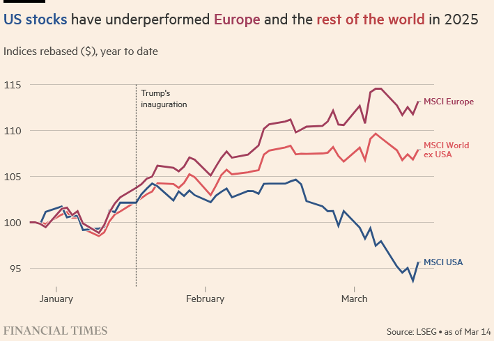 Now, that doesn’t necessarily mean there will be a US recession; as the old joke goes, the stock market has forecast 9 out of the last 5 of those. But if Trump persists with his tariff nonsense—neither he nor the true believers in the Trump 2.0 administration have given any indication that he’ll stop—growth expectations and share prices will continue to adjust accordingly.