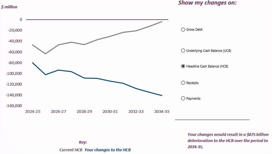 That’s why Treasury’s projections are for a big deficit in 2024-25, and then more deficits ad infinitum. And if you tweak the PBO’s build your budget tool just a little – moving Treasury’s economy assumptions to the ’lower’ scenarios – you’ll see it can quite easily get a whole lot worse: