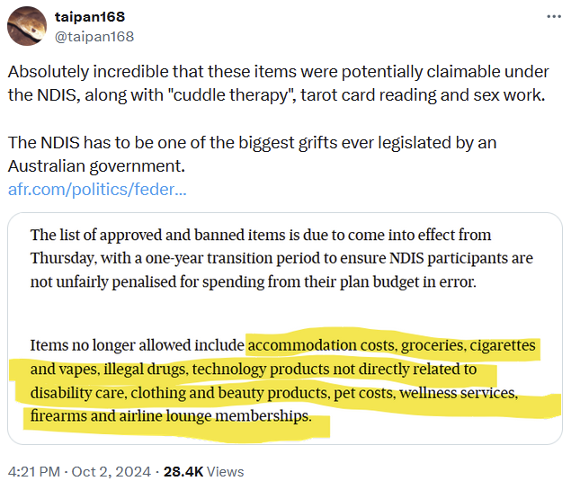 And as we know, a lot of those new jobs are in health care, largely due to the ballooning National Disability Insurance Scheme (NDIS). That money is almost certainly not being spent efficiently, unless you consider these ‘items’ to be a productivity-enhancing use of tax dollars: