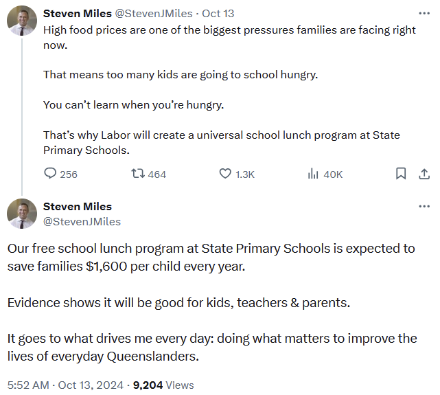 There are also equity issues. While there is indeed evidence that having well-nourished students is good for “kids, teachers & parents”, Miles’ scheme isn’t even remotely targeted. It’s effectively a transfer, with the $1,600 “saved” by households of primary school children coming at the expense of the childless and households without kids in primary school.