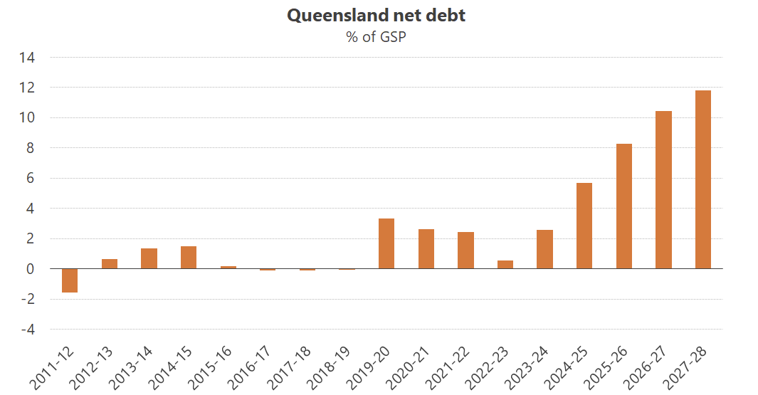 “The biggest change [since the budget] occurs in Queensland, where a large uptick in infrastructure spending and pre-election cost-of-living handouts mean debt could end up more than $10 billion higher by 2027 relative to pre-budget projections.”