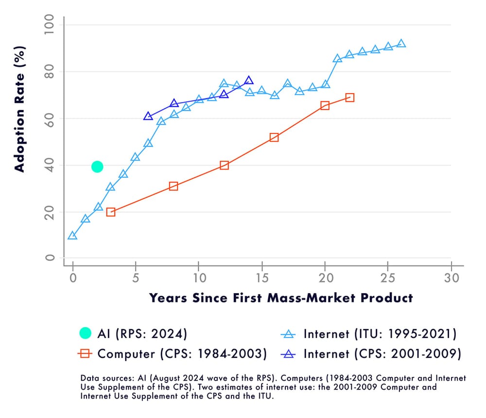 LLMs work on top of computers and the internet, so it makes sense that they’d be adopted at a faster rate – the legwork was already done.