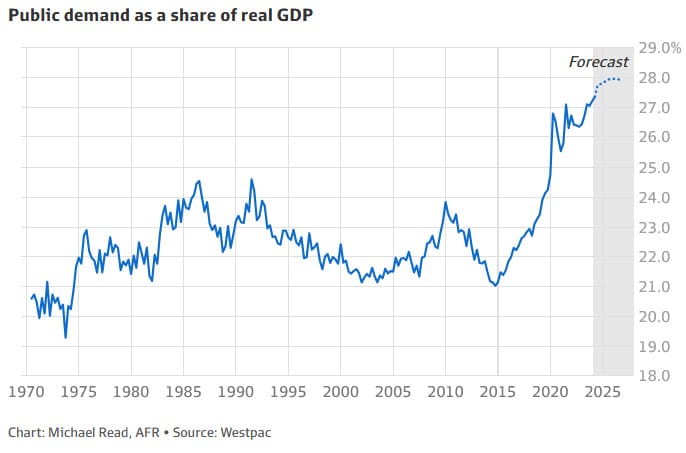 The cause of higher food (and other) prices was an increase in demand fuelled by monetary and fiscal policy, and the only people to blame work(ed) in Parliament House and Martin Place. Albo is trying to deflect attention away from his own government, which is spending more as a share of GDP than any government in Australia’s history: