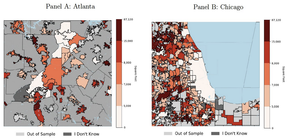 Anyone looking at how to increase housing affordability needs to know how each specific city (or suburb!) regulates housing supply. Here’s a map comparing minimum residential lot sizes in Atlanta and Chicago: