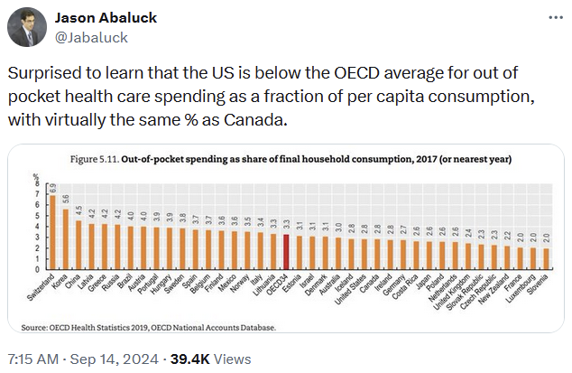 In many other OECD countries – including Australia – most health care spending is funded by taxpayers. Either way, there’s not a single OECD country that spends more than 7% out of pocket for health care. Even Singapore (not an OECD country), where over half of all health care spending was out of pocket as recently as 2005, now only pays about 20% out of pocket.