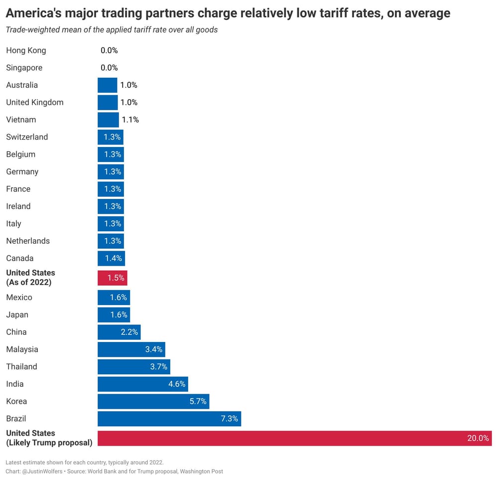 As for the inclusion of VATs—the only way to get Australia to 10% is to count the GST—as being equivalent to a trade barrier (they’re not even close), there are two reasons for that. First, legal constraints limit Trump’s options for unilateral tariffs to ‘reciprocity’. Second, Trump needed an excuse to get rates up because most countries don’t actually tariff US goods all that much: