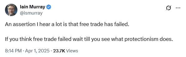 Meanwhile, the large body of recent empirical work showing that the Trump 1.0 and Biden tariffs raised costs for consumers, lowered incomes, and reduced manufacturing employment, were conveniently omitted.