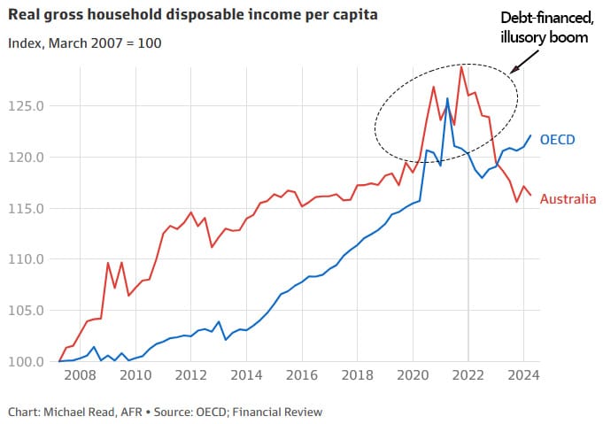 No, incomes increased during the pandemic because the benefits of debt-driven inflation happen right away, while the costs take a while to be realised. Eventually they had to, and now they’re below the pre-pandemic trend as interest rates take their toll: