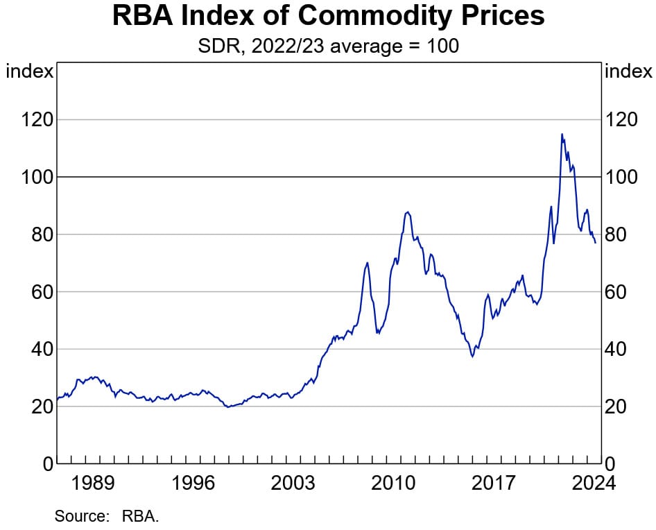 Adding to the weakness is falling commodity prices. Australian budgets live and die by these, especially in states like Western Australia, and they’ve come off a lot in recent months. Still a long way from the depression-level 2015-16 lows, but the trend is what’s worrying: