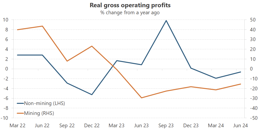 We’re not in a technical recession (GDP contracting over two consecutive quarters) largely because population growth and " strength in public demand" are keeping total activity churning along. But even that looks set to have weakened in the June quarter to around 1% growth from a year ago, according to Bloomberg.