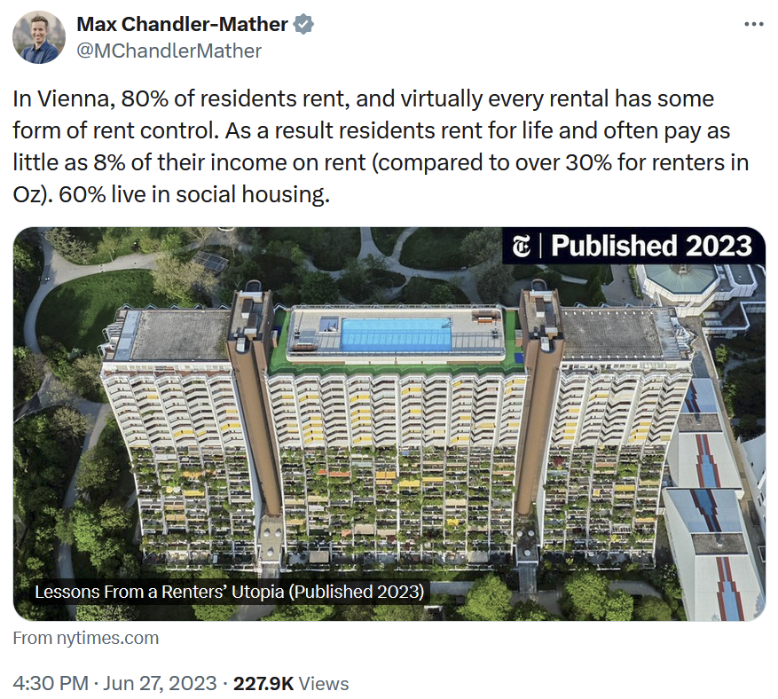 The context missing from Chandler-Mather’s takeaway is Australia. Countries have different cultures, norms, and institutions developed over hundreds of years, and they tend to be quite rigid, making it incredibly difficult to ’transplant’ what works in one place somewhere else. I mean, Vienna’s housing model hasn’t even spread to the rest of Austria despite being around for a hundred years. And for all of its perks, it’s far from perfect – for example, it favours the established middle class over “the really poor and needy”, and is less “newcomer-friendly” than Australia’s housing regime.