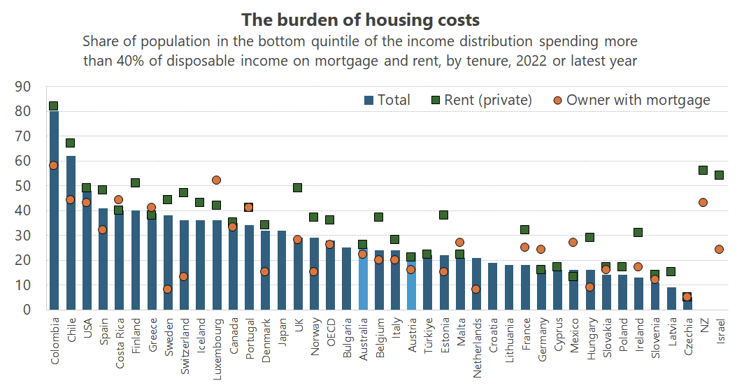 At least as far as the lowest income households are concerned, Australia and Austria are relatively similar (there’s no data for Vienna specifically). In Australia, around 25% of those in the bottom quintile spend 40% or more of their disposable income on housing, versus around 23% in Austria. Both countries are below the OECD average of 28%: