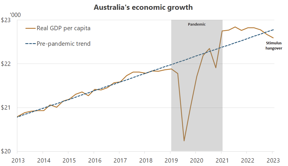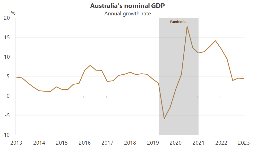 The first thing I’ll note is that an economic slowdown was probably inevitable after the stimulus-fuelled largesse of 2021-23, a period when nominal GDP (NGDP) – a broader indicator of aggregate demand pressures than the consumer price index – was consistently growing in the double-digits.