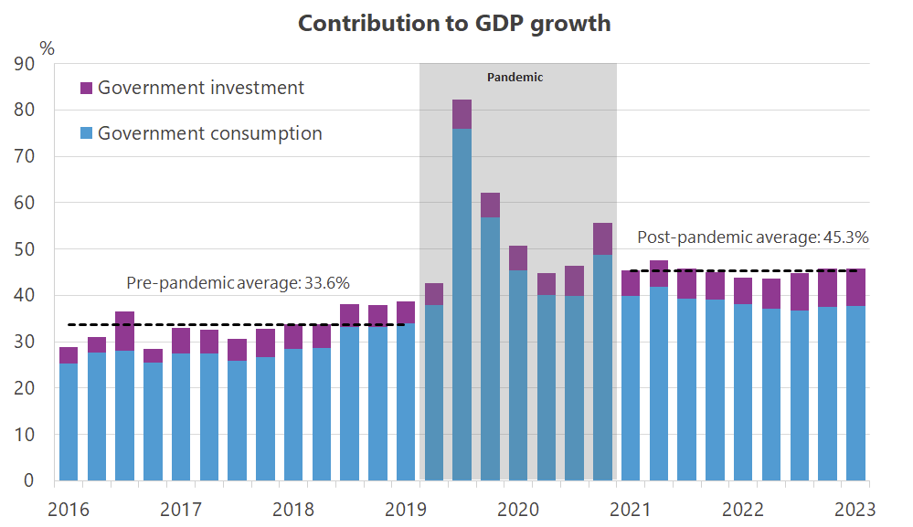 Generally speaking, a larger role for less productive government consumption crowds out the private sector (the government can only consume by taxing the private sector or through borrowing, the latter of which will need to be paid with future taxes or inflation), and probably contributed to the excess aggregate demand that led to inflation and cost of living crisis. If we want to help improve productivity and reduce inflation, we’re probably going to need to see those blue lines come back down.