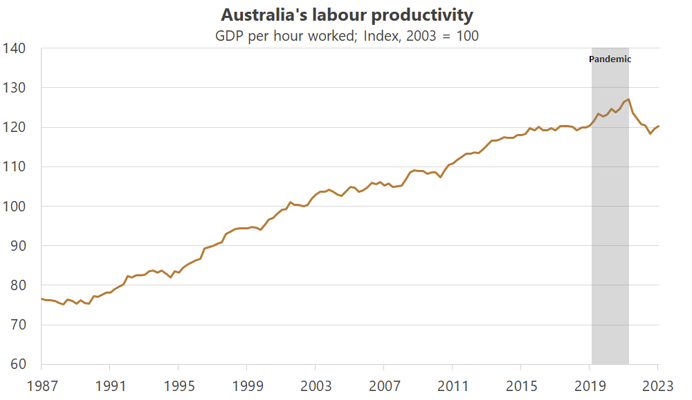 According to the Productivity Commission, the post-pandemic decline in labour productivity was due to people having to work more hours to support themselves amidst the cost of living crisis, and these “new workers did not match the (measured) productivity of those already in the workforce, bringing overall productivity down”.