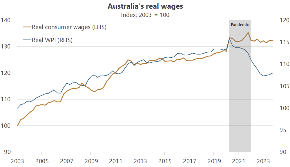 The lack of productivity growth has implications for real wages, given the before-mentioned links between the two. The most common way to measure real wages, and what you will have seen in the media and from politicians bemoaning their decline, is by deflating the wage price index (WPI) for inflation. But the WPI has considerable lags, ignores bonuses, and may not fully capture pay increases people might get from switching jobs.