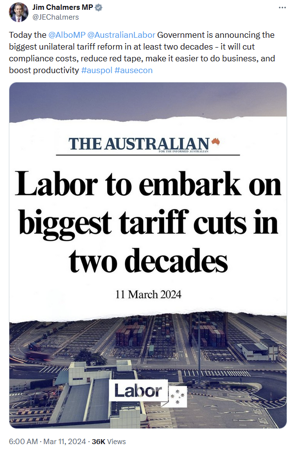 It was a great move, and one can only wonder why more than a decade of ‘pro-business’ Liberal leadership never got around to doing it; none of the goods tariffed are even made in Australia, so it’s not like there would have been any interest group resistance.