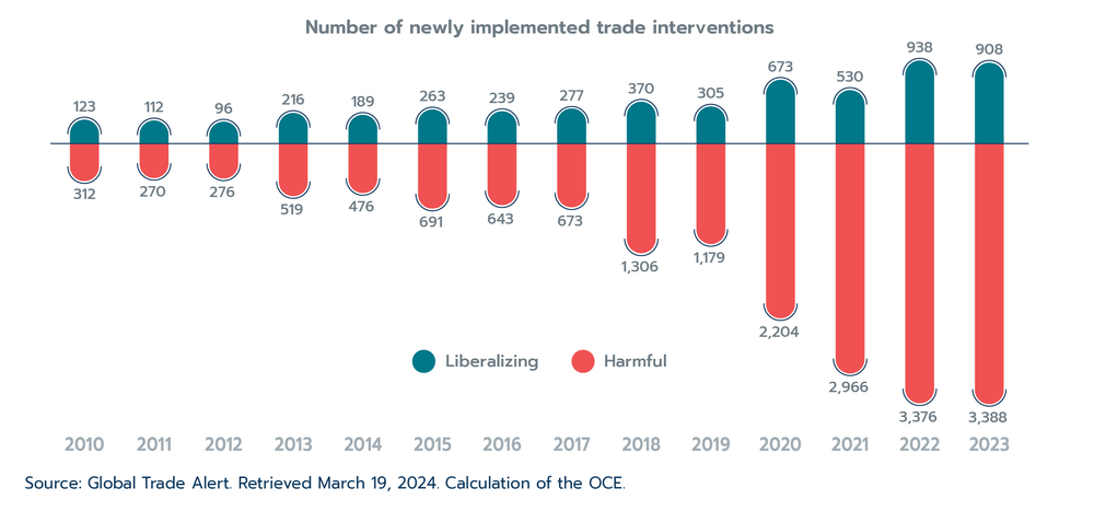 Another key risk for Canada (and Australia!) is the rise in global protectionism. The Biden administration has escalated the US war on trade, and a 2025 Trump administration would almost certainly accelerate it even further. That has triggered retaliation, with global trade interventions rising steadily since 2018.
