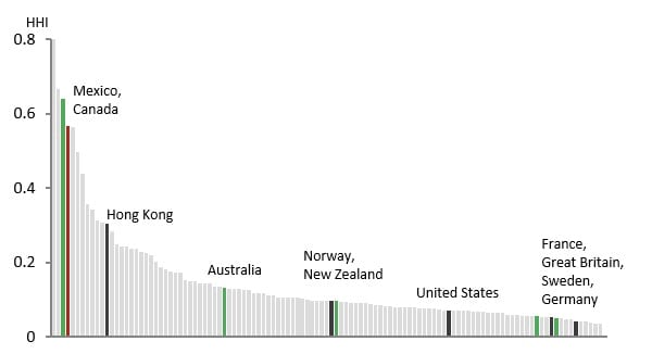 Some 90% of Canadians live within 250km of the US border and that proximity, combined with the ease of trade thanks to various national agreements, means that around 50% of its imports and 75% of its exports are from/to the US. In a global context, Canada’s trade is one of the most concentrated, behind only Kuwait, Bermuda, and Mexico.