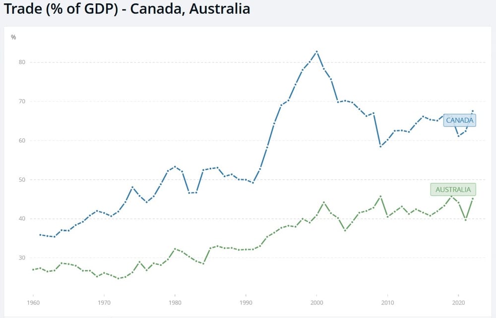 Unlike Australia, Canada’s constitution doesn’t guarantee free trade within Canada; as a result, it is often “easier for Canadian companies to do business across international borders than it is within our own country”:
