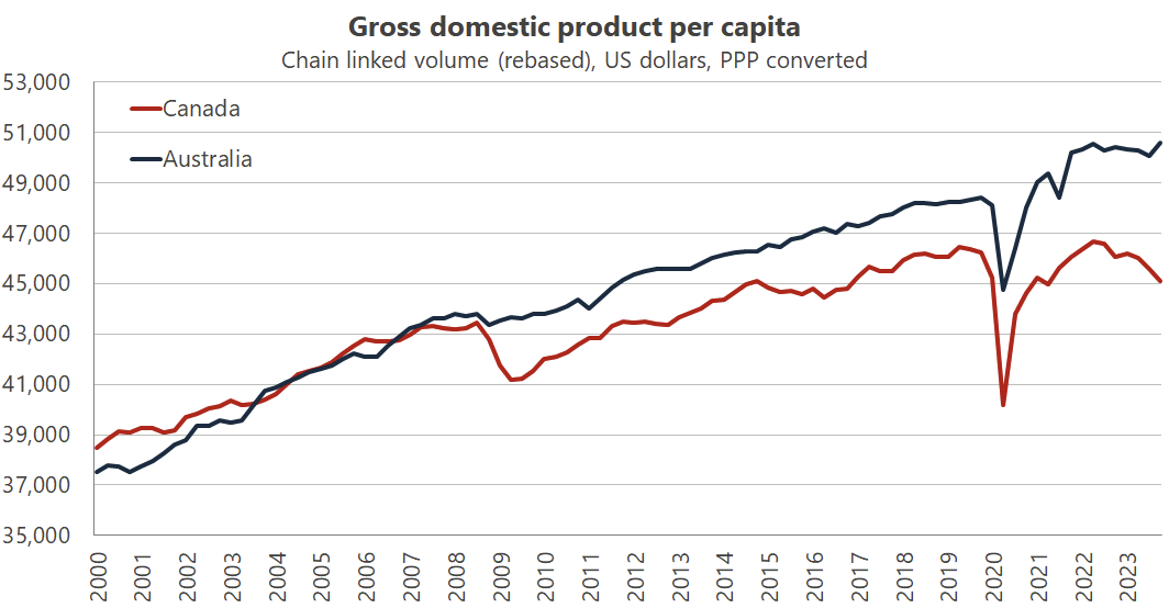 Only one of those options will improve long-run living standards for Canadians. But given the current situation I’m not so sure that, when push comes to shove, it’s the option Canada will choose. If so, policymakers in Australia would do well to watch and learn from the Canadian experience over the next several years.