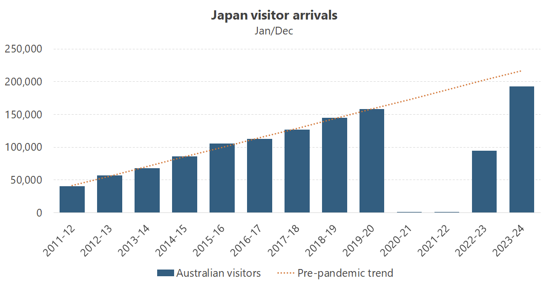 But despite the sensationalist headlines about the “staggering” increase in tourism over the past year, we shouldn’t get too far ahead of ourselves. In the decade prior to the pandemic, Australian peak-season tourism (Dec/Jan) to Japan was growing at an annual growth rate of more than 20%. The 2023-24 increase has been impressive, but tourist numbers are still below the pre-pandemic trend.