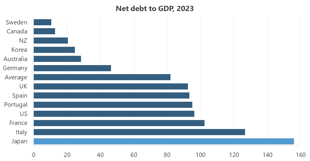 But Japan’s government has been leading the world in terms of indebtedness for decades. There is, of course, a point at which net debt reaches levels so high that markets begin to doubt whether the government will pay it back. But it’s not clear Japan is at that point yet (although Greece wasn’t at that point either… until it was).