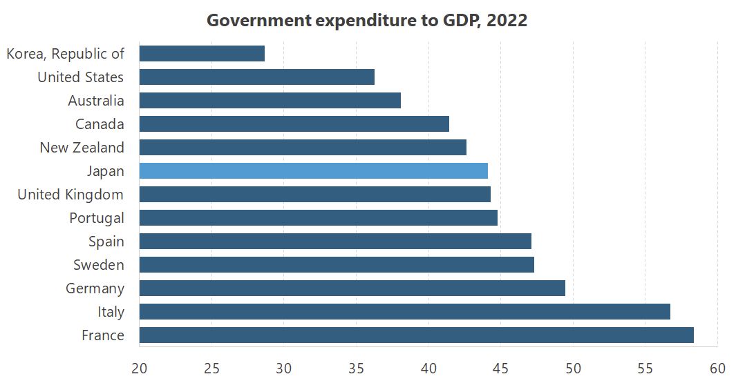 There are a few reasons why Japan’s public debt is probably still manageable. First, if we take the same group of countries we did earlier, Japan’s public expenditure to GDP is in the middle of the pack; i.e., it isn’t anything to be especially worried about, at least in the context of a debt crisis (I’d be more concerned about Italy). Japan still has the fiscal capacity to raise taxes.