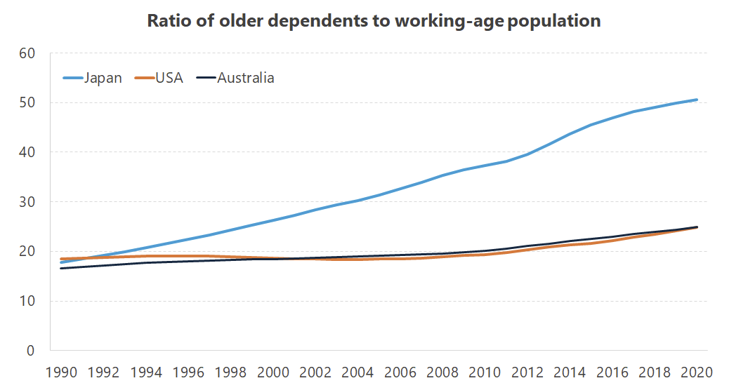 Basically, it doesn’t have enough young people; its ability to produce workers to pay for its government’s spending has been declining for decades, both due to low fertility rates but also its unwillingness to permit much immigration, relative to countries such as the US, Canada and Australia (Joe Biden gaffed on the weekend, accusing Japan of being “xenophobic. They don’t want immigrants.”).