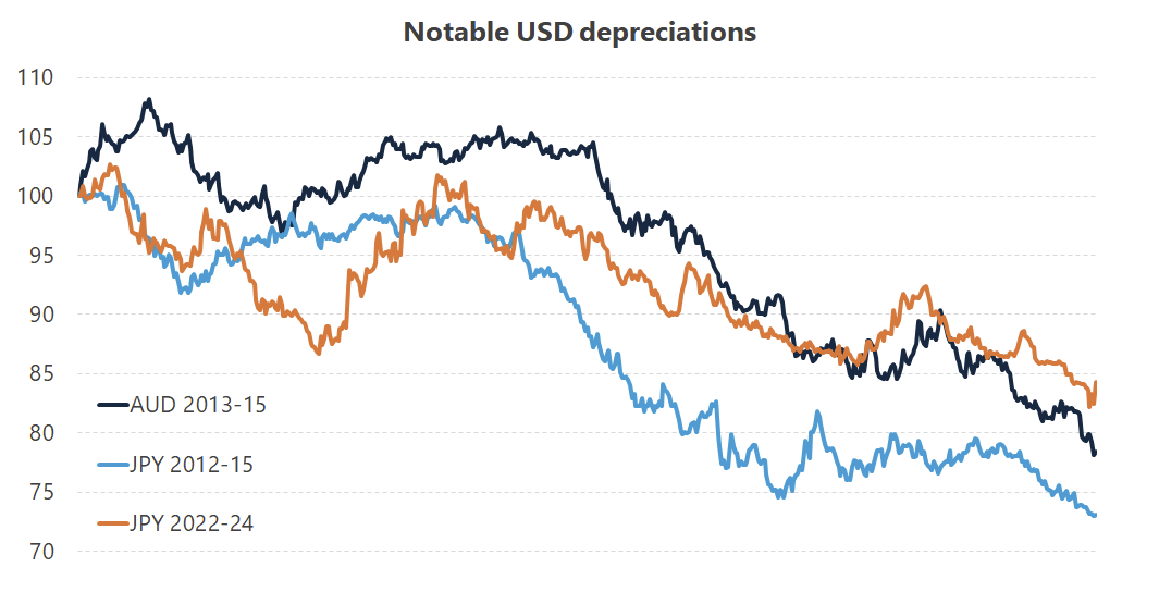 Japan is still a big investor and goods manufacturer but a lot of that now takes place offshore. That insulates corporate Japan somewhat from exchange rate movements, so a weaker yen is not as effective as it once was in terms of boosting Japanese exports, but it is effective in boosting corporate profitability. Even with the yen’s 16% depreciation against the US dollar since the start of 2023, Japan’s Nikkei index is up 28% in US dollar terms over the same period (nearly 50% in yen terms).