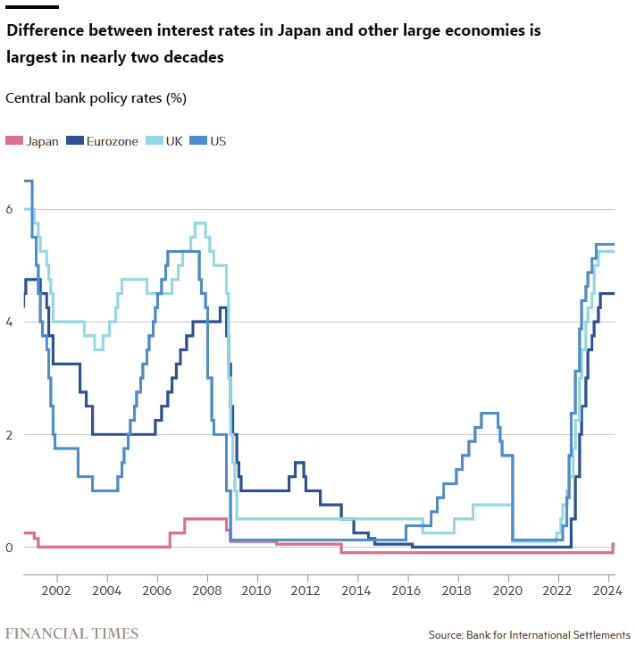 The BOJ has over a trillion US dollars in reserve – which it accumulated during the decades of trying to reduce the value of the yen – and while those may not last long if confidence in the yen were to collapse, that doesn’t seem likely. While the BOJ will inevitably burn some of those reserves trying to slow the decline in the yen, it’s ultimately pushing against a string: the difference between yields overseas and in Japan has widened since other central banks started tightening monetary policy in 2022/23, and that’s what’s causing the yen to depreciate. You can’t stop those forces with currency market intervention alone.