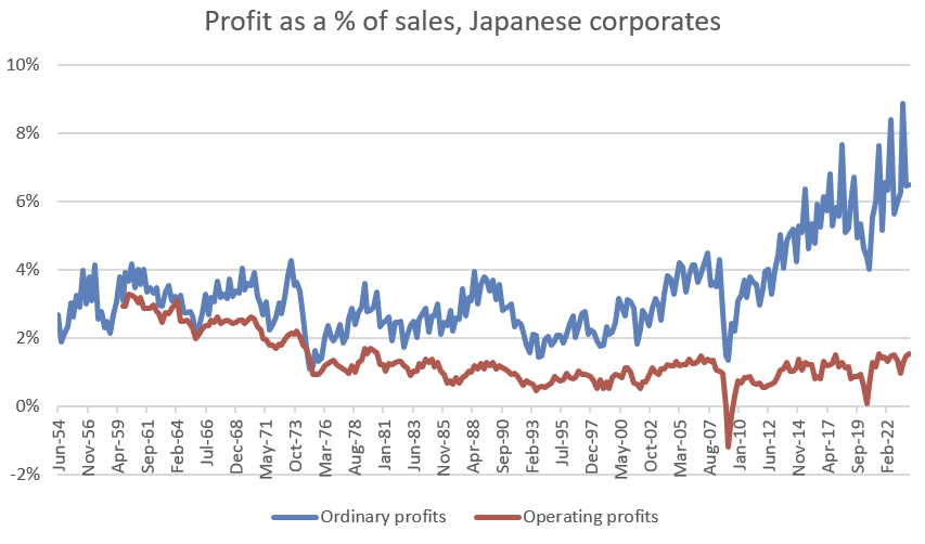 Just because I don’t think Japan will have a currency crisis doesn’t mean I’m optimistic about Japan’s economy. A fantastic place for a holiday, sure, but it clearly has an unsustainable debt problem that needs to be repaired (which will further sap private sector growth), is a country where real wages haven’t risen for a decade and has chronic labour shortages due to its aging population. It is now much more profitable for corporate Japan to invest offshore than domestically (“ordinary profits” include net interest income, “operating profits” do not), and they’re not even sending the proceeds back to Japan anymore.