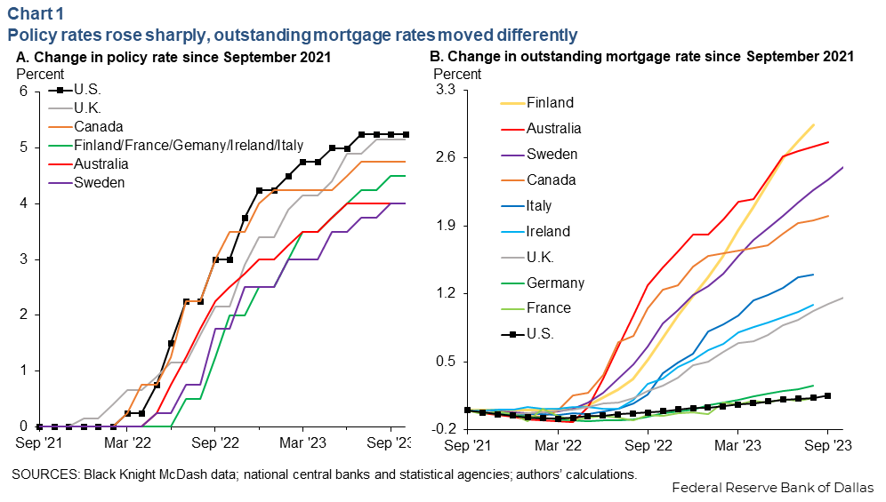 Higher interest rates transmit much more quickly through to consumption in Australia, where mortgages are predominately variable. We can clearly see that difference in the data, courtesy of the Dallas Fed.