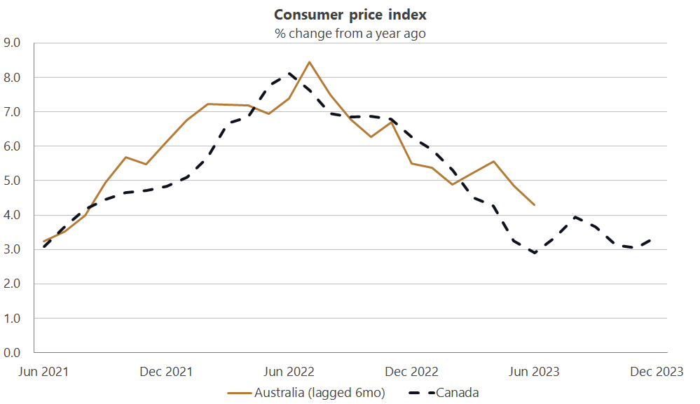 It’s hard to spend when you’re trapped in your house! But the fiscal and monetary ammunition had already been fired, with the lockdowns only delaying inflation’s grip on Australia. If we show the same chart but with Australia lagging Canada by 6 months from July 2021, the two line up reasonably well.