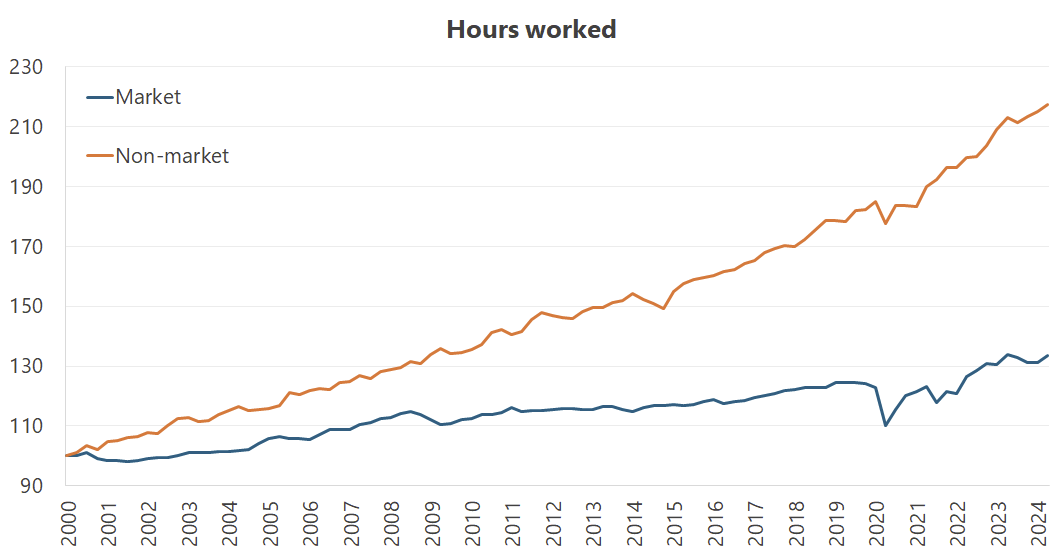 But while that difference between the two has been especially large in recent years, it’s part of a longer-run trend: non-market work such as health care really has been soaking up an awful lot of labour. Since 2000, non-market hours worked have increased by 117.4%, while market hours worked are up just 33.6%.