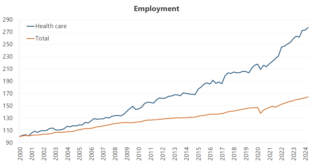 It means the share of work that’s being done in non-market sectors is now nearly 30%, up from around 20% in 2000. And a lot of that is going into health care: as a share of total employment, health care sits at 15.8%, up from 9.5% in 2000 and 12.6% in 2015.