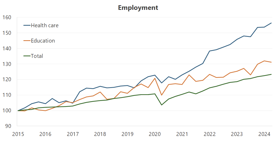 “Almost all of the growth in employment over the past year has been in the non-market sector (largely health and social assistance, public administration and education). The big increase of spending on the NDIS in particular has supported non-market sector employment.