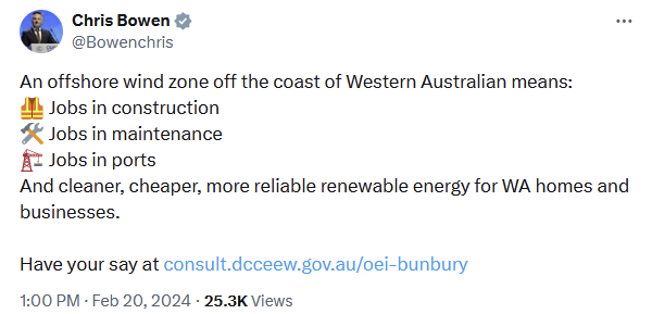 Based on its actions, the Albanese government intends to prioritise jobs at all costs, specifically union jobs. Its “new approach” to industrial policy, using grants and subsidies to prop up green energy industries in the name of the environment, is a cover. Just look at this tweet from Energy Minister Chris Bowen: