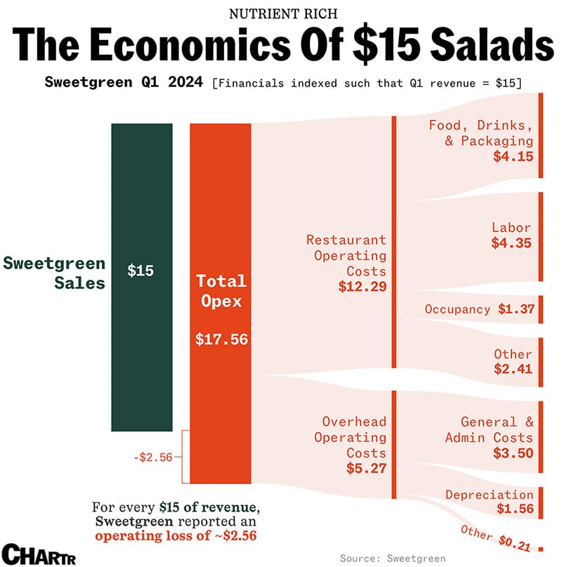 I’m going to end on a slightly odd note: salads. Hear me out. I recently came across an article on Sweetgreen, an American premium salad company. They don’t exist in Australia, but in their recent earnings report they provided a very interesting summary of how much they make – or in this case, don’t make – from each $15 salad they sell.